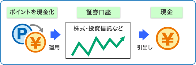 ポイントを現金化して、その資金をもとに株式や投資信託などを購入します。売却すれば現金資産となるため、通常の投資と同じ感覚で資産運用が可能です。ただし、売却益や分配金などに対しては、約20%の税金がかかります。また、実際の金融商品を購入することになるので、証券口座の開設が必要です。