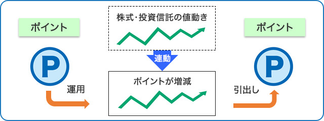 ポイントをそのまま運用し、擬似的に投資を体験できます。株式や投資信託の値動きに連動して、ポイントが増減する仕組みとなっており、実際にお金が増減するわけではありません。証券口座がなくても、スマホのアプリなどで簡単に始められます。
