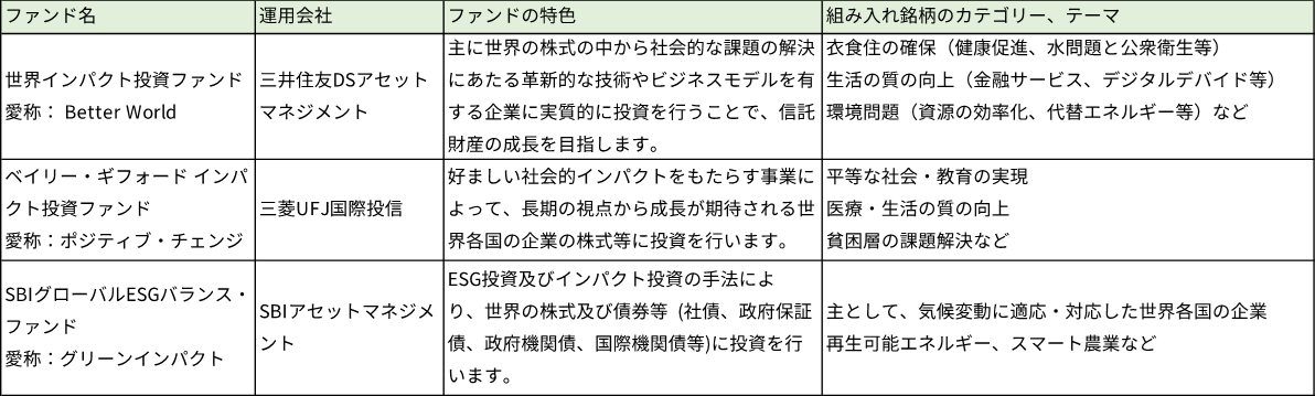 貧困削減や教育の改善など社会的課題の解決に取り組む事業の資金を調達するために発行される債券です。例えば、独立行政法人国際協力機構(JICA)が発行する個人向け「JICA SDGs債」などがあります。 - インパクト投資ファンド (投資信託):