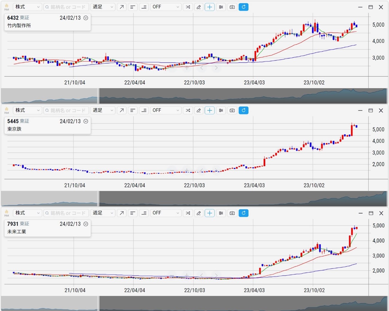 その点では未来工業(7931、第5位、3,260円→4,645円、+42.5%)の動きも目立ちました。住宅向けの配線管、スイッチボックスなど電設資材メーカーの未来工業は1月24日に第3四半期の決算を発表し、売上高が340億円(+13.4%)、営業利益が57.0億円(+74.1%)と好調が確認されました。