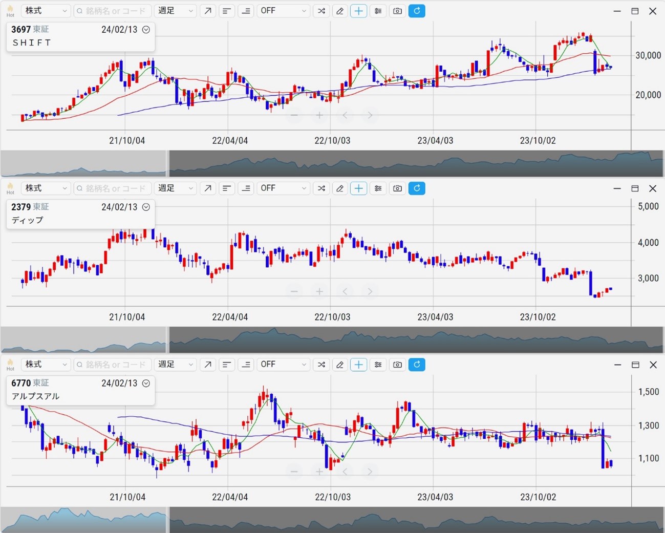 このほかにも3月決算企業の第3四半期決算では、アルプスアルパイン(6770、第30位、1,229円→1,102円、▲10.3%)、日本航空電子(6807、第6位、3,225円→2,555円、▲20.8%)がそろって決算内容の悪化を背景に大きく下落しました。