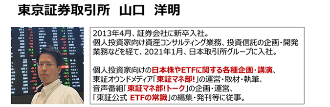 司会進行に国山ハセン氏をお招きして、東京証券取引所・山口洋明氏と当社シニアファンドマネージャー古賀直樹が登壇。東証が進めるTOPIX再編の背景や狙いについて東証より解説し、後半は日本株ならびに日本企業の現状と今後の見通しについて、日本株運用歴27年となる古賀が解説しました。