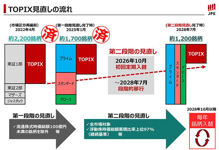 TOPIXの見直しでは、プライム、スタンダード、グロースへの市場区分再編を踏まえて、市場代表性や投資対象としての機能性をより高めようという目的があります。TOPIXは、市場区分再編前は約2,000銘柄でした。これはイコール当時の東証一部の銘柄数です。2025年1月に第一段階の見直しで約1,700銘柄になりました。この段階でもプライム銘柄が多数を占めています。2028年7月の第二段階の見直し完了時には約1,200銘柄まで減ります。