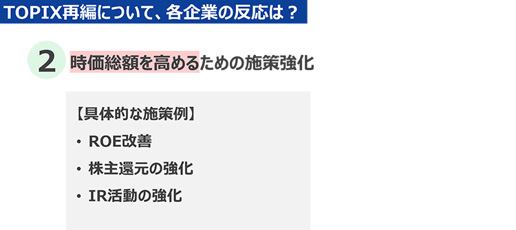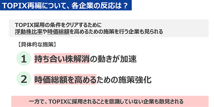 今までは東証一部に上場したら、ずっとTOPIXに入ったままでしたので、全く意識されていませんでした。それがTOPIX再編で経営者の意識は変わり始めています。現状は、TOPIX採用を意識している企業とそうではない企業が併存している印象です。