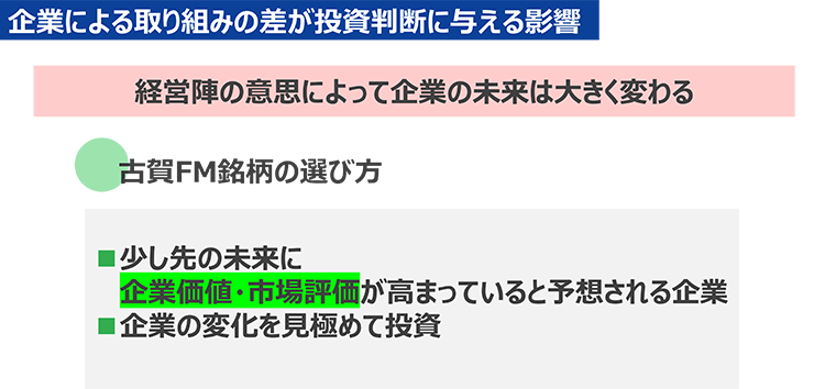 最初にぶっちゃけた話をすると、私たちは指数を意識していないので、TOPIX再編が直接的に企業を選ぶ上で影響することはないです。ただし、TOPIX再編は、基準を満たしている企業を選別していく改革ですから、投資家に選ばれるような企業になっていくという変化が期待できる点は注目のポイントだと思っています。