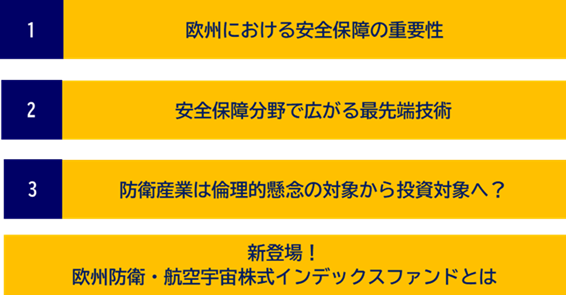 欧州における安全保障の重要性、安全保障分野で広がる最先端技術、そして、欧州の防衛・航空宇宙関連企業の成長期待について、イメージを交えてわかりやすくご説明しています。