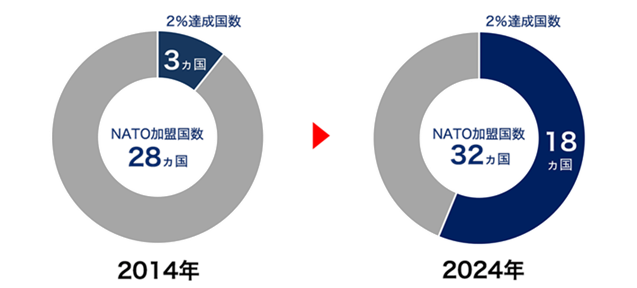 2014年時点で対GDP比2%目標を達成していたのはわずか3ヵ国でしたが、2024年には18ヵ国に増加しました(推計値ベース)。