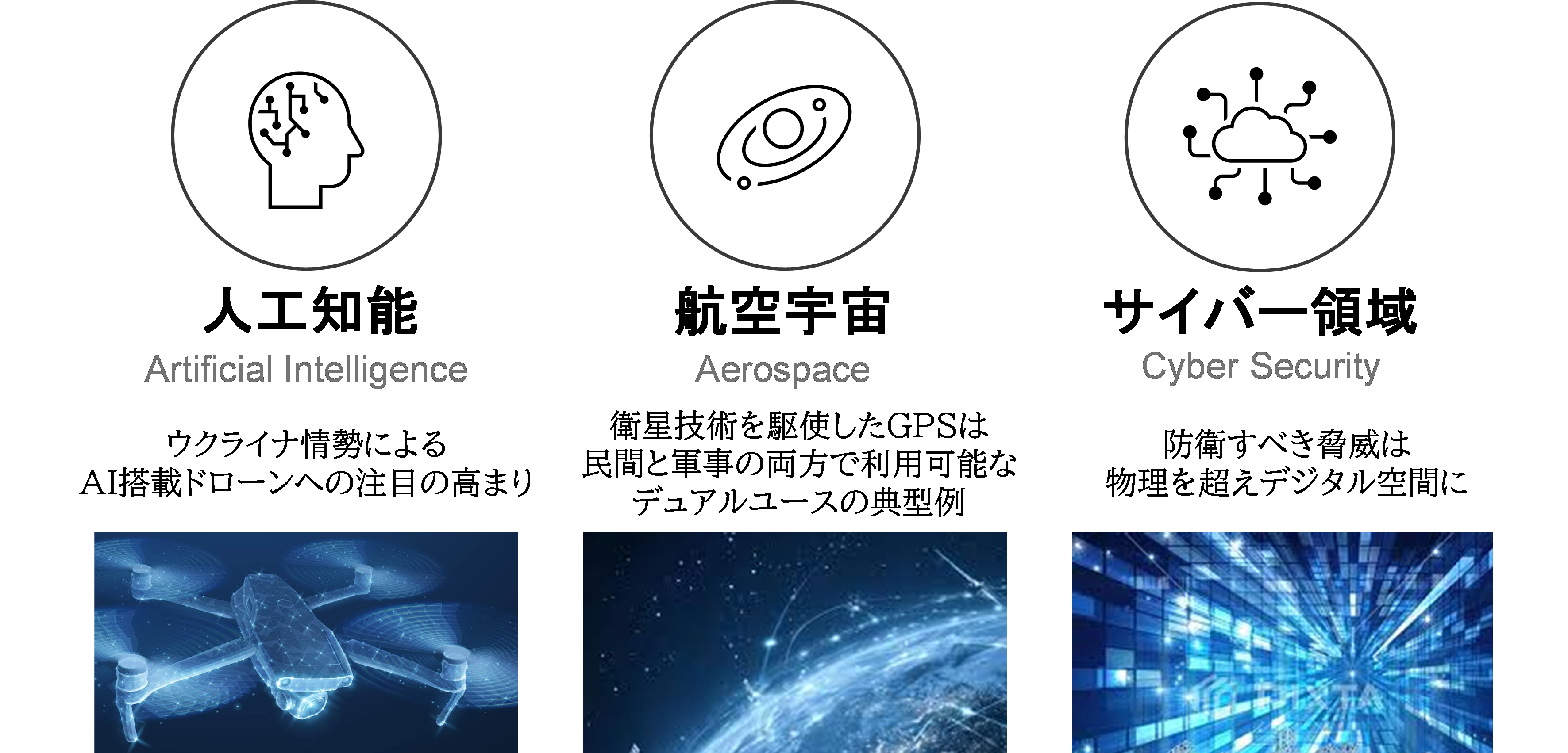無人システムの自律性向上や大量のデータ分析には、AI(人工知能)の活用が不可欠となっているほか、GPSの精度向上や衛星通信の強化、高度化するサイバー攻撃への対策など、現代の防衛技術は従来の「陸・海・空」を超え、宇宙空間やサイバー空間へと広がっています。