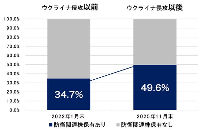 従来、防衛関連株の組み入れに慎重だった欧州のESGファンドでも、地政学的リスクの高まりを背景に保有比率が増加傾向にあります。2022年1月時点では防衛関連株を保有するファンドは34.7%でしたが、2025年11月時点には49.6%へと大幅に上昇しました。