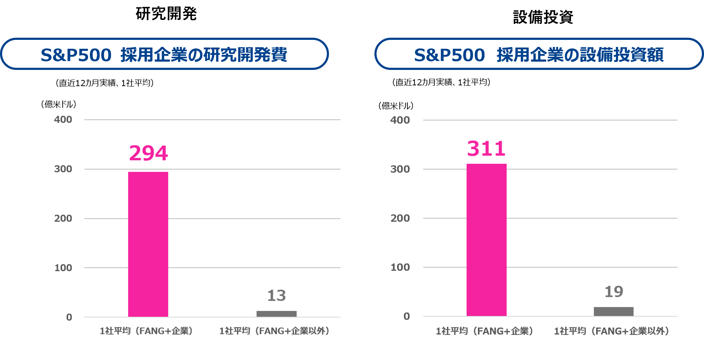 FANG+企業は、総じて研究開発に積極的で、その投資額はFANG+企業以外の1社平均と比較しても圧倒的に巨額です。また、外部技術を活用するための、買収(M&A)や投資、外部企業との共同開発など多様な方法で外部技術を取り入れています。