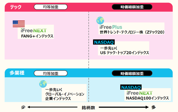 テック株ファンドは、ビッグテックへの比率が高めの傾向があるなど共通点はあるものの、それぞれ投資戦略は異なります。銘柄数や対象先(国・地域・業種)、構成比率の決め方(時価総額加重平均か均等加重平均か)によって、各ファンドのリターン・リスクは異なります。各ファンドの特徴をよく知ったうえで、どのファンドに投資するのか、投資配分などを考えてみましょう。
