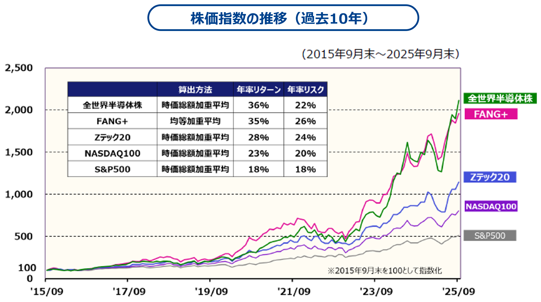 期間:2015年9月末~2025年9月末 ※2015年9月末を100として指数化 ※米ドルベース、配当なし