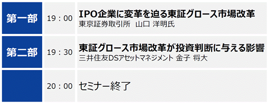 司会進行に国山ハセン氏をお招きして、東京証券取引所・山口洋明氏と当社シニアファンドマネージャー金子将大が登壇。前半は東証が今年4月に発表したグロース市場改革の概要や背景、狙いを解説し、後半は足元のIPO企業の動向や銘柄の選び方、グロース市場改革による影響について金子より解説をいたしました。