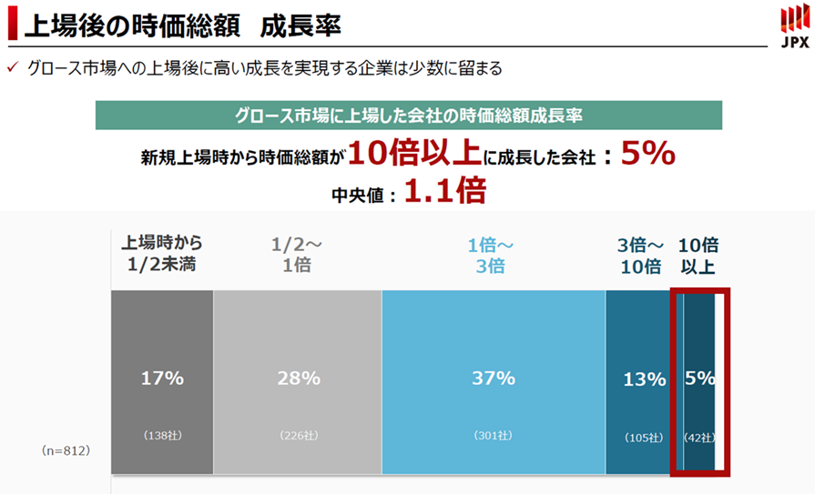 まず、グロース市場において、新規上場してから時価総額が10倍以上に成長した企業は全体の5%に留まっています。