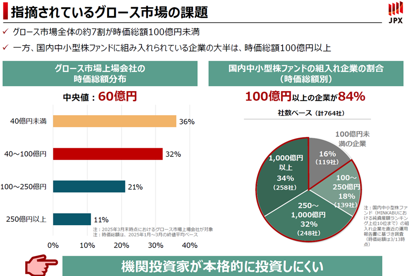 また、中小型株への投資を行う(プロの投資家である)機関投資家が投資するには、多くの場合に時価総額100億円以上の規模感が最低でも必要という声が多いのですが、グロース市場に上場している企業の時価総額の中央値は60億円です。大きな金額を動かす機関投資家としては本格的に投資がしにくい状況だと考えられます。