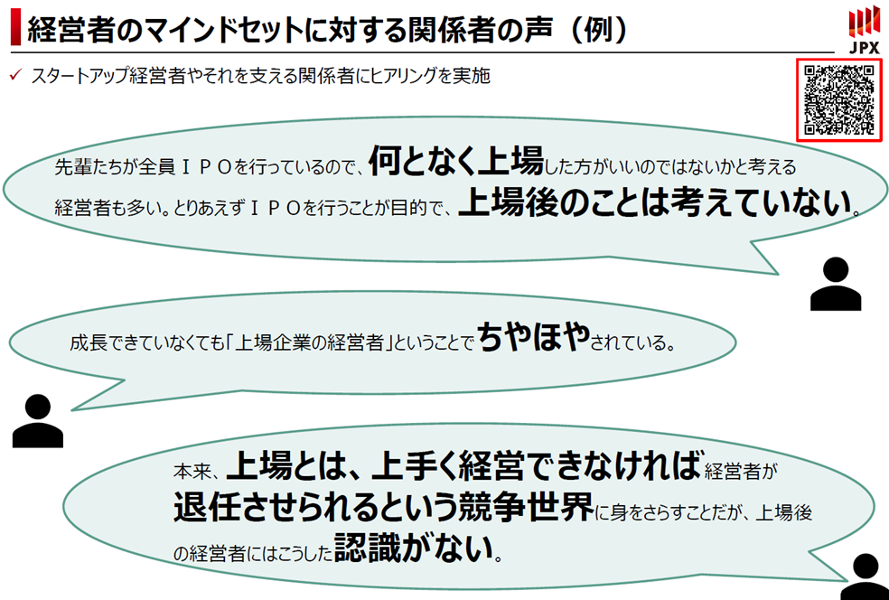 定性的な話になりますが、東証がスタートアップ経営者や機関投資家へのヒアリングを実施したところ、経営者の意識に関する意見も多く見られました。例えば、「先輩たちが上場しているから、何となく上場した」「上場後のことは考えていない」「上場会社の経営者ということでちやほやされる」「上場とは、上手く経営できなければ経営者が退任させられるという競争世界だという認識がない」などの赤裸々な声がありました。