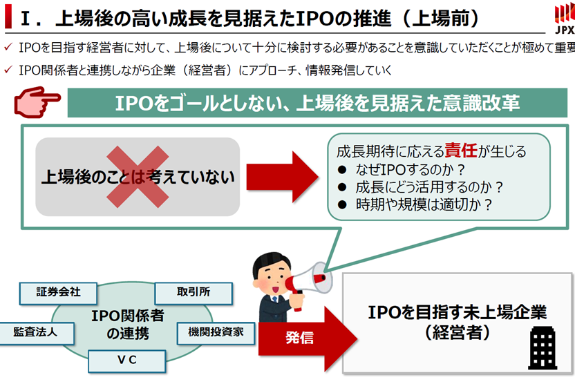 まず上場後の高い成長を見据えたIPO推進です。IPOはゴールではなく、成長のための手段です。なぜIPOをするのか、上場がどのように会社の成長に活かされるのか、上場の時期、規模は適切なのかということを十分に検討していただいた上で上場するのが大事になります。上場するにあたって、投資家がどのようなことを期待しているか、責務については、証券会社、監査法人、ベンチャーキャピタルなどの関係者とともに情報発信してまいります。