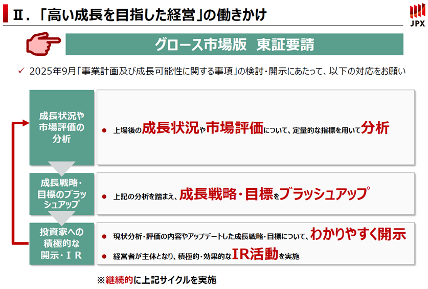 「高い成長を目指した経営の実現に向けた対応の働きかけ」を2025年9月に行いました。2025年12月には、投資家が評価しているグロース上場企業の取組み事例の提供を行います。また、2026年の年明けを目途に、2025年9月に東証が行った「高い成長を目指した経営の実現に向けた対応の働きかけ」を踏まえて対応をしている企業を一覧化し、取り組みを手軽に探せるような特設サイトを作る予定です。