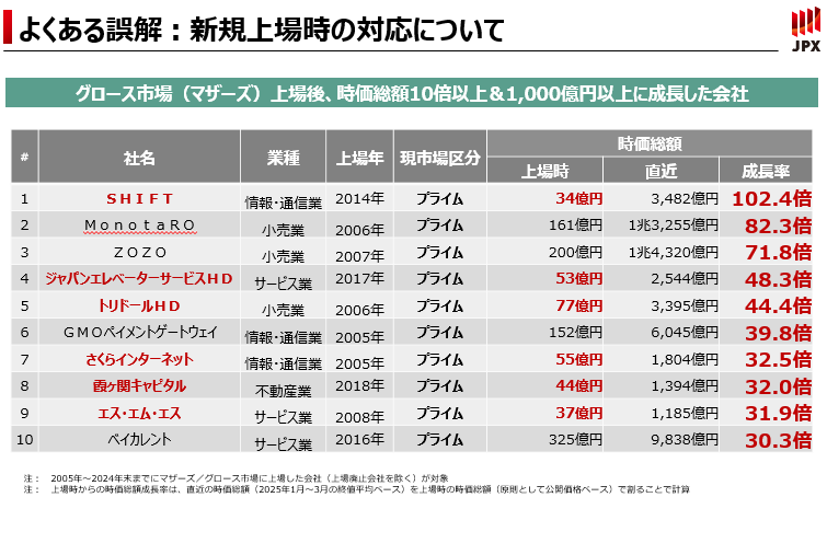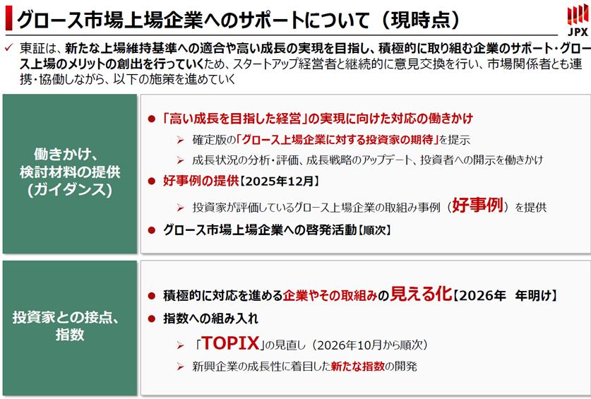最後にTOPIXの見直しですが、引き続きグロース市場にとどまっていても、TOPIXに組み入れられる可能性があります。それから、新興企業の成長性に着目した指数も開発しており、2026年3月からは新指数「JPXスタートアップ急成長100指数」の算出も開始される予定です。