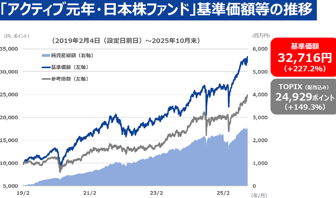 現在「アクティブ元年・日本株ファンド」を運用していまして、足元基準価額が3万円を超え、パフォーマンスとしては良好に積み上げられています。グロース株やIPO株もこれに大きく貢献していますので、リアルなお話をお届けできると思っています。