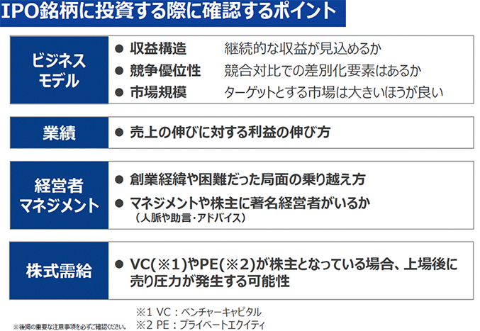 一般的な企業の調査とあまり変わらない部分もありますが、どういったビジネスモデルなのか、収益構造、競争優位性、市場規模を見極めます。加えて直近の業績がどうなっているかを確認した上で、IPO銘柄で重要だと考えている経営者のマネジメント、株式需給を見ています。経営者のマネジメントに関しては、創業の経緯や、困難だった局面をどう乗り越えてきたのかを聞きますし、株主に著名経営者がいるかという点も見ます。また、IPOならではのことですが、ベンチャーキャピタルやPEファンドが株主になっている場合、いつかどこかのタイミングで株式を売却しなくてはならないので、彼らの売却行動が株式需給に与える影響を見極める必要がある点が、IPO銘柄のポイントかなと思います。