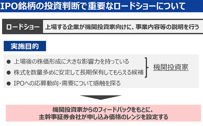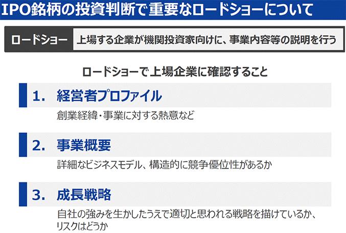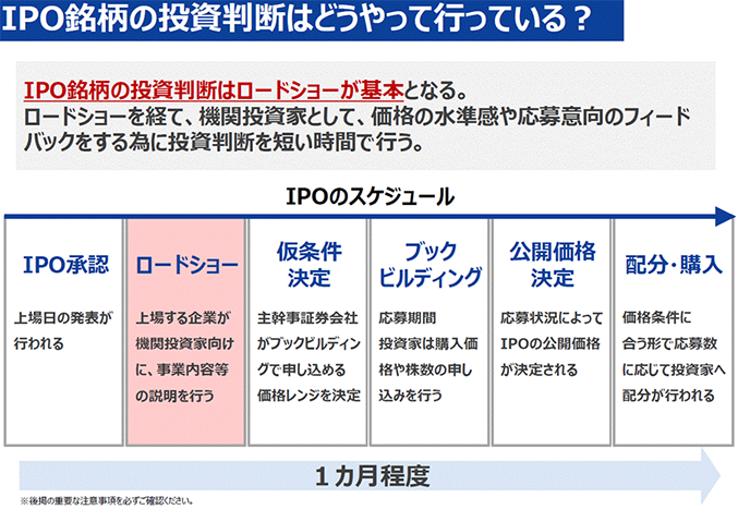 個人投資家と同じ部分もありますが、機関投資家ならではのポイントとして、「ロードショー」というものがあります。IPOの承認が降りてから上場するまで1ヶ月程度あります。その間に、機関投資家にロードショーとして、企業の経営者がIRミーティングをしています。経営者と直接向き合って、どういう会社なのか、どういう成長戦略なのかを聞けるというところが、機関投資家ならではと思います。