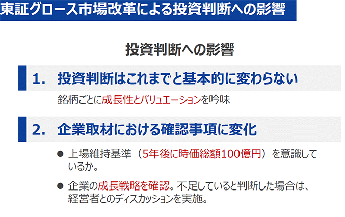投資判断はこれまでと基本的に変わることはないのですが、今回の上場維持基準の変更は、結構インパクトの大きい話です。5年後に時価総額100億円以上にならないと、上場廃止になるか、他の市場に移らなくてはならないことは、かなり大きな問題です。そこをちゃんと意識しているかは、企業取材時に確認しています。