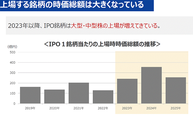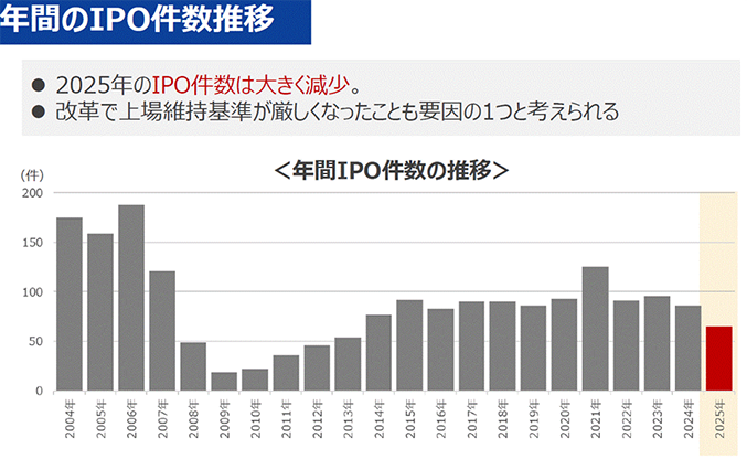 IPOの件数のところが大きな変化だと思っています。2025年は年間100社弱ぐらい出るかと思っていたのですが、65社になっているので、明らかに上場維持基準が厳しくなったことが影響していると思われます。代わりに、IPO1銘柄当たりの平均時価総額が上がっています。