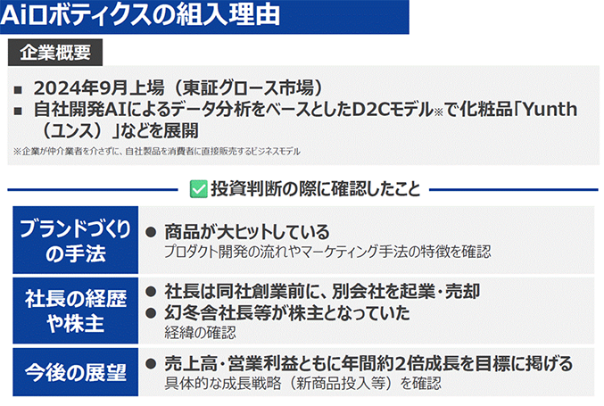 具体的にどうやってそのIPO銘柄の判断を行っているのかという点で、金子さんが運用するアクティブ元年・日本株ファンドの組入上位になっているAiロボティクスを例にお話を伺えればと思います。