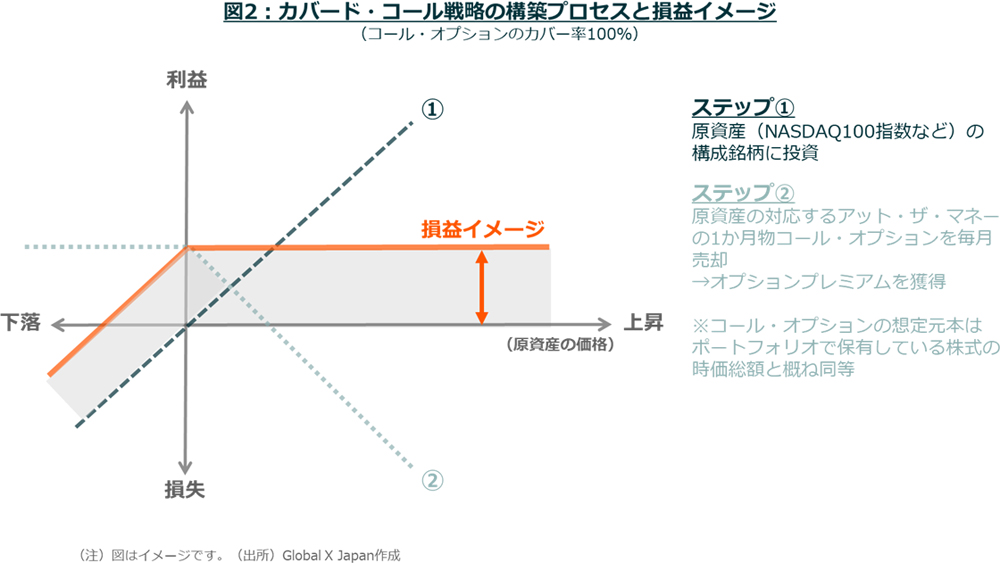 カバード・コール戦略とは、特定の資産(原資産)を保有しつつ、保有している資産のコール・オプション(予め決められた価格:権利行使価格でその資産を買う権利)を売却する投資戦略です(図2)。