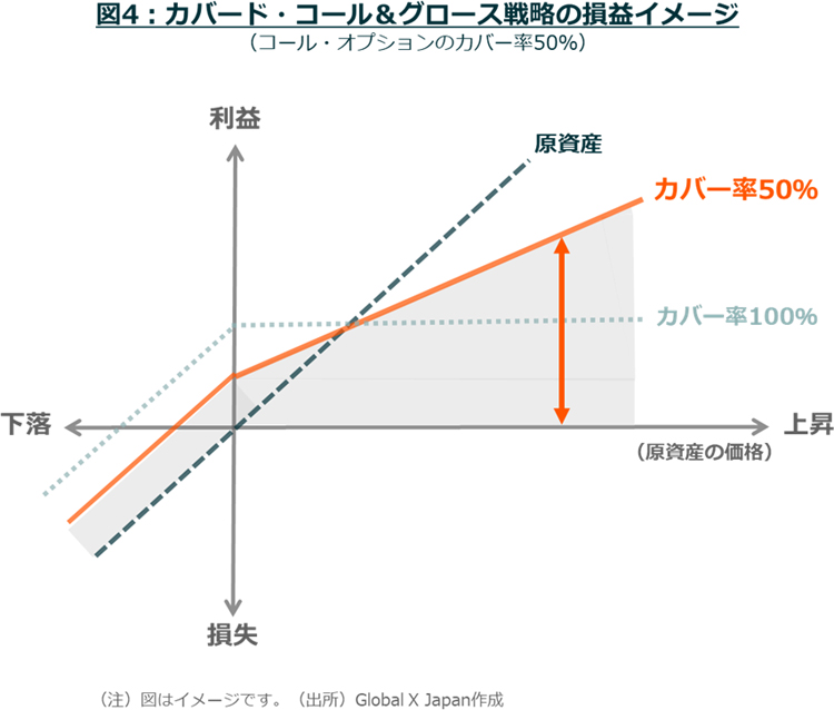 そこで、コール・オプションの売却を半分(50%)にし、インカムとキャピタル双方の獲得を狙ったのが「カバード・コール&グロース戦略」です(図4)。