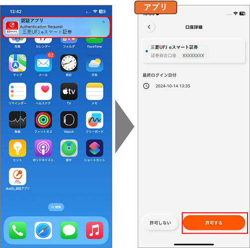 「三菱UFJ eスマート証券 認証アプリ」の登録済のお客さまがログイン操作に二要素認証を求められる場合、「本人確認画面」が表示されると同時に、登録の端末にプッシュ通知されます。