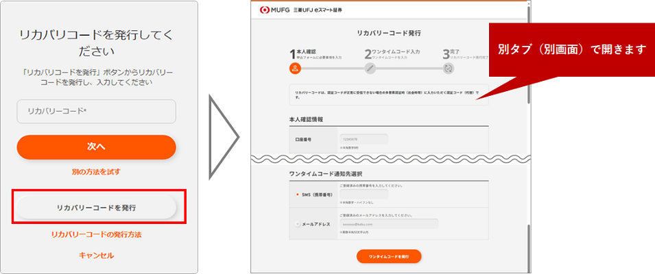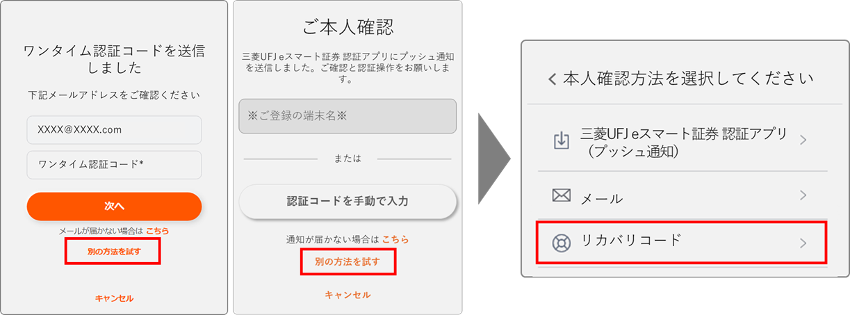 - ワンタイム認証コードが通知されない場合、「別の方法を試す」を押下いただき、リカバリコードによる認証を試すことも可能です。