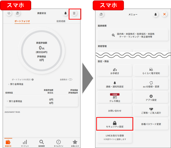 ログイン後ページ>右上の三本線>「セキュリティ設定」画面を開く。
