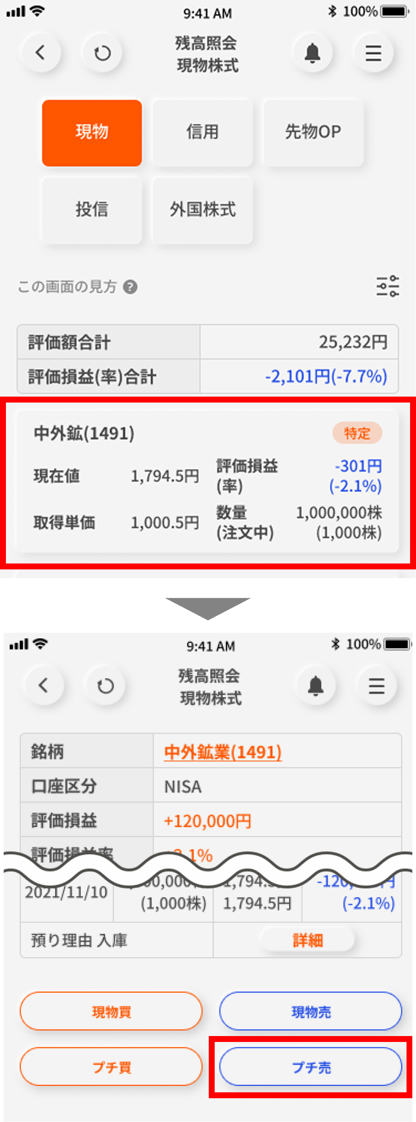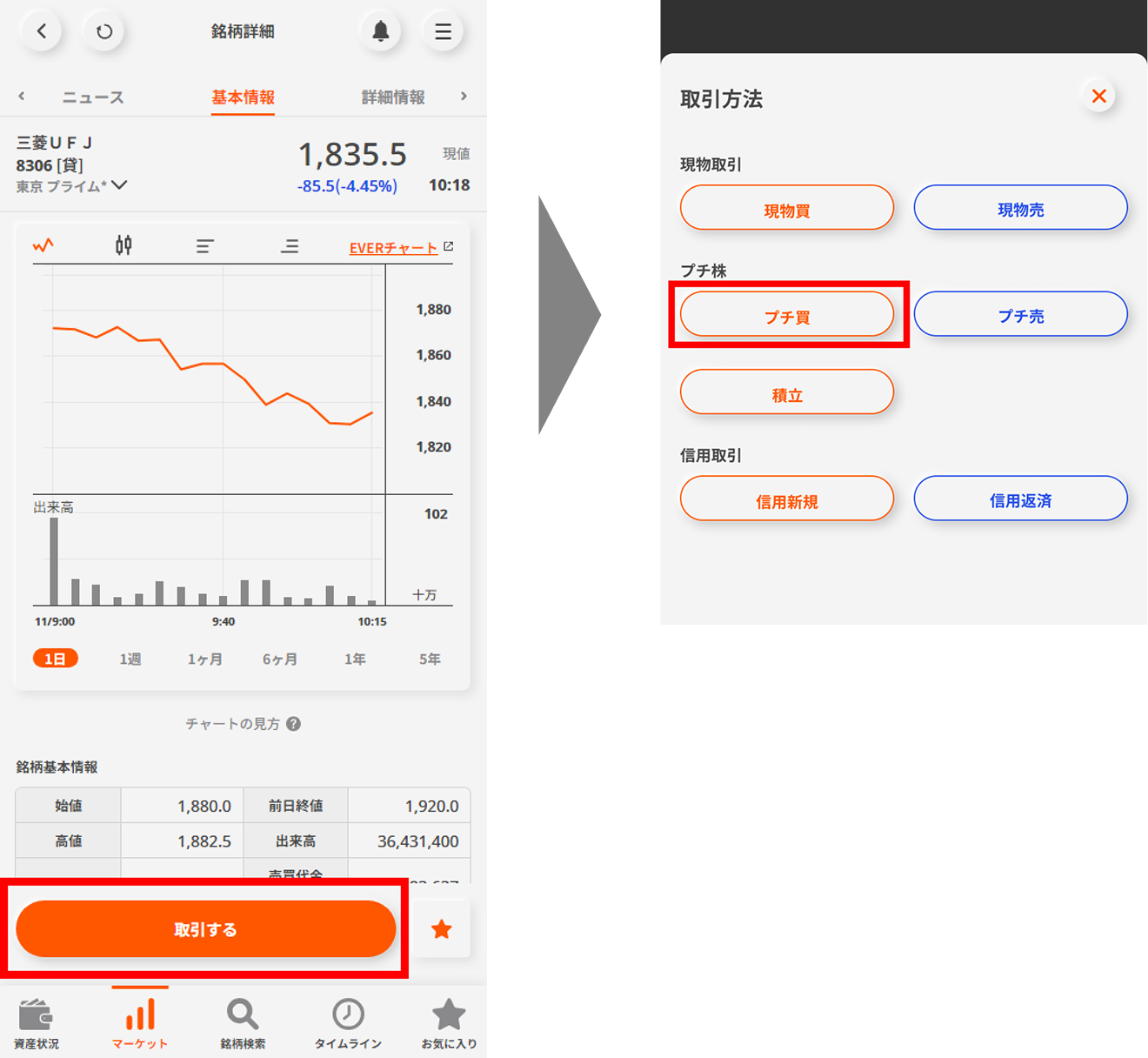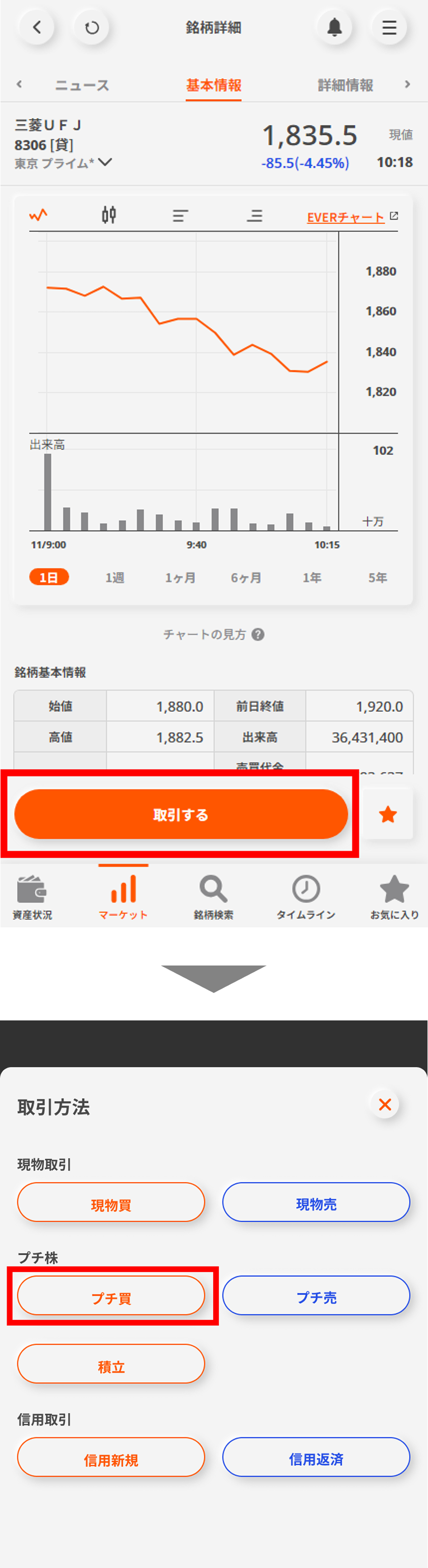 画面下部の「取引する」ボタンを押して「プチ株」をタップする。