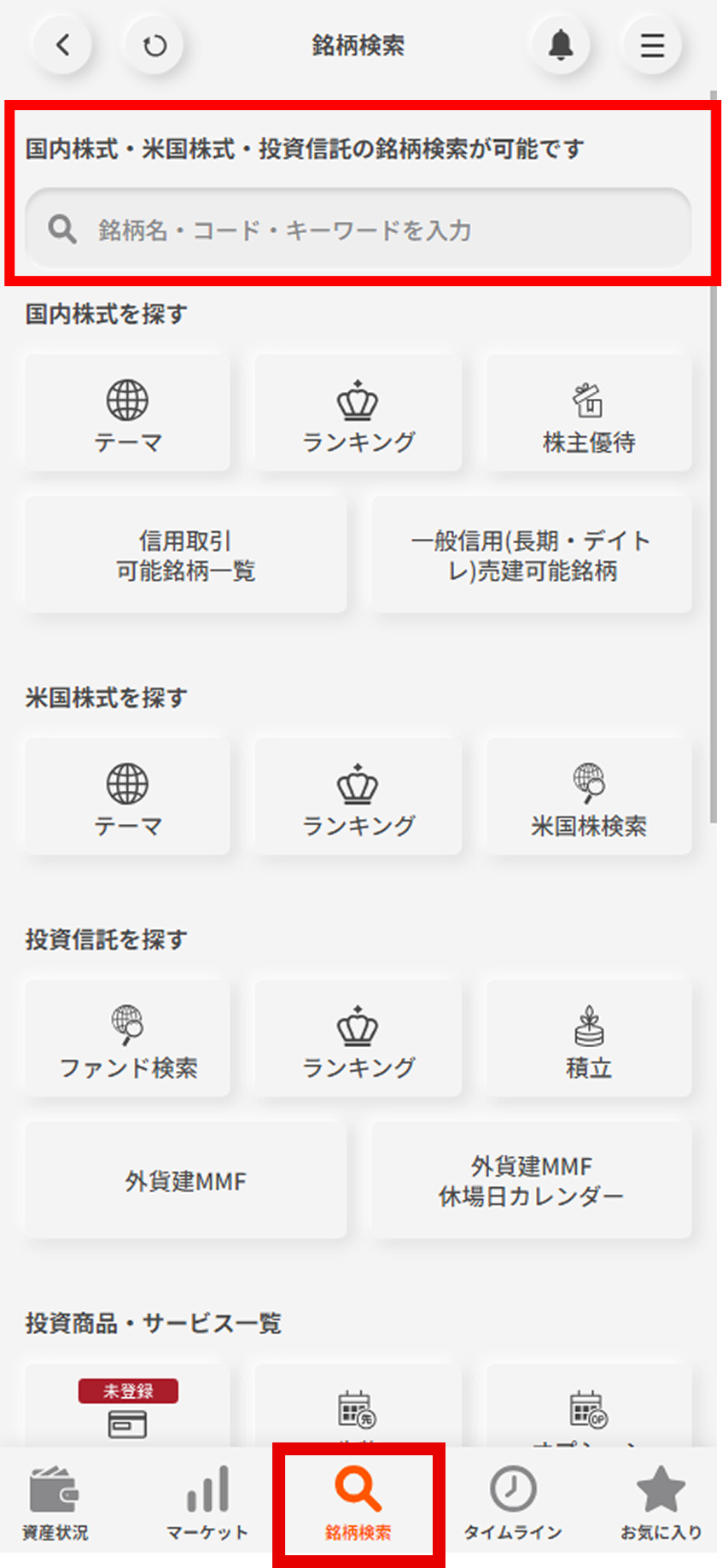 画面下部の銘柄検索を選択し、