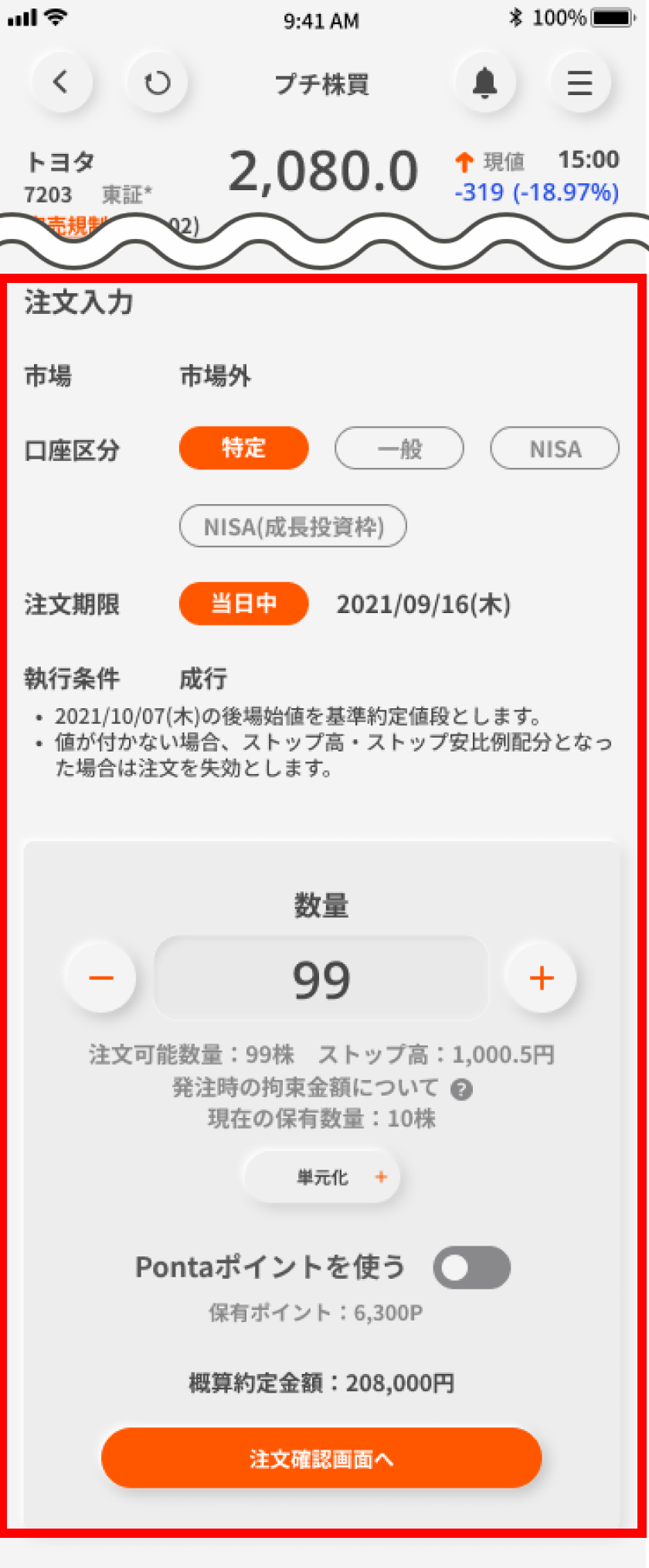 注文内容を入力のうえ、