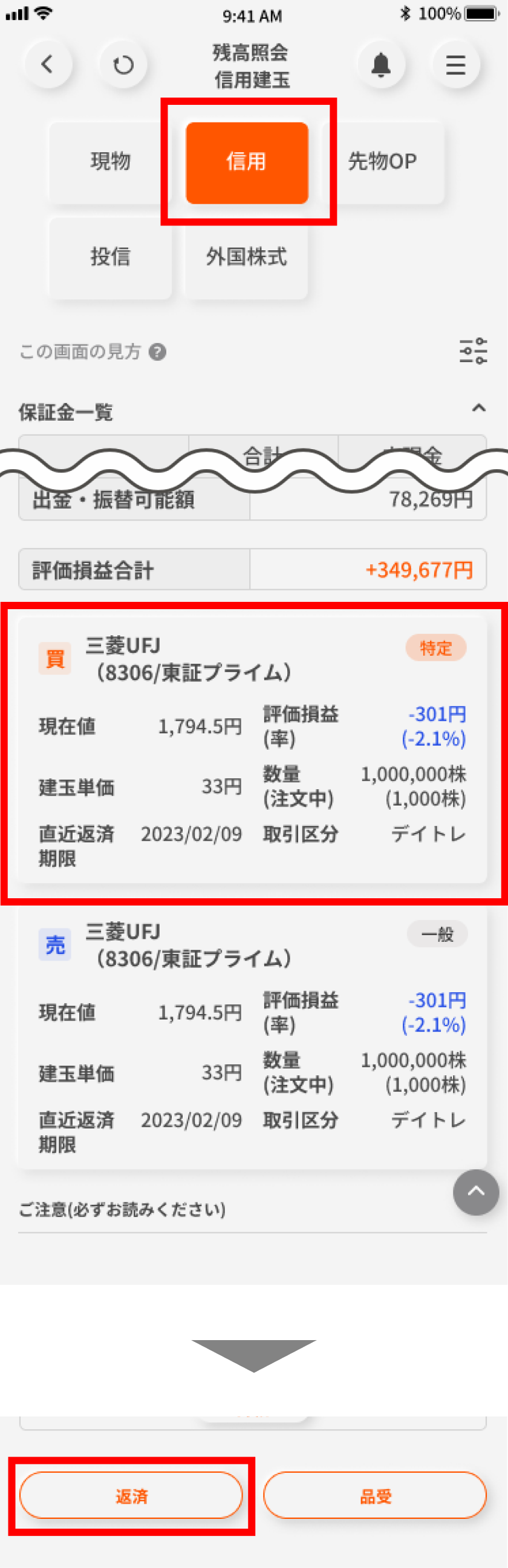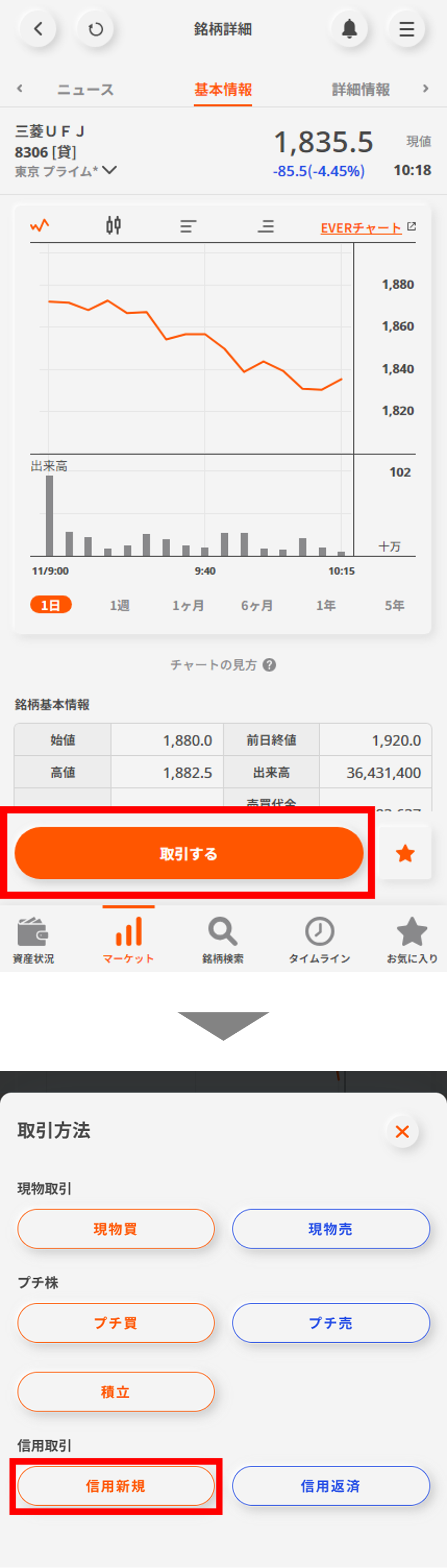 画面下部の「取引する」ボタンをタップして、「信用新規」ボタンを選択する。