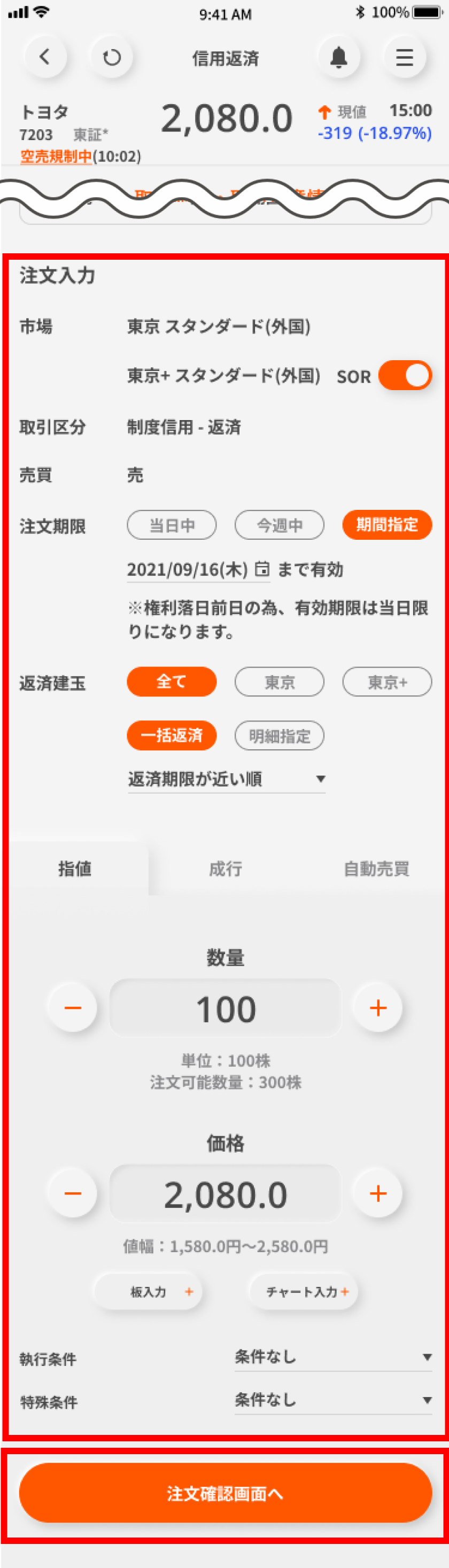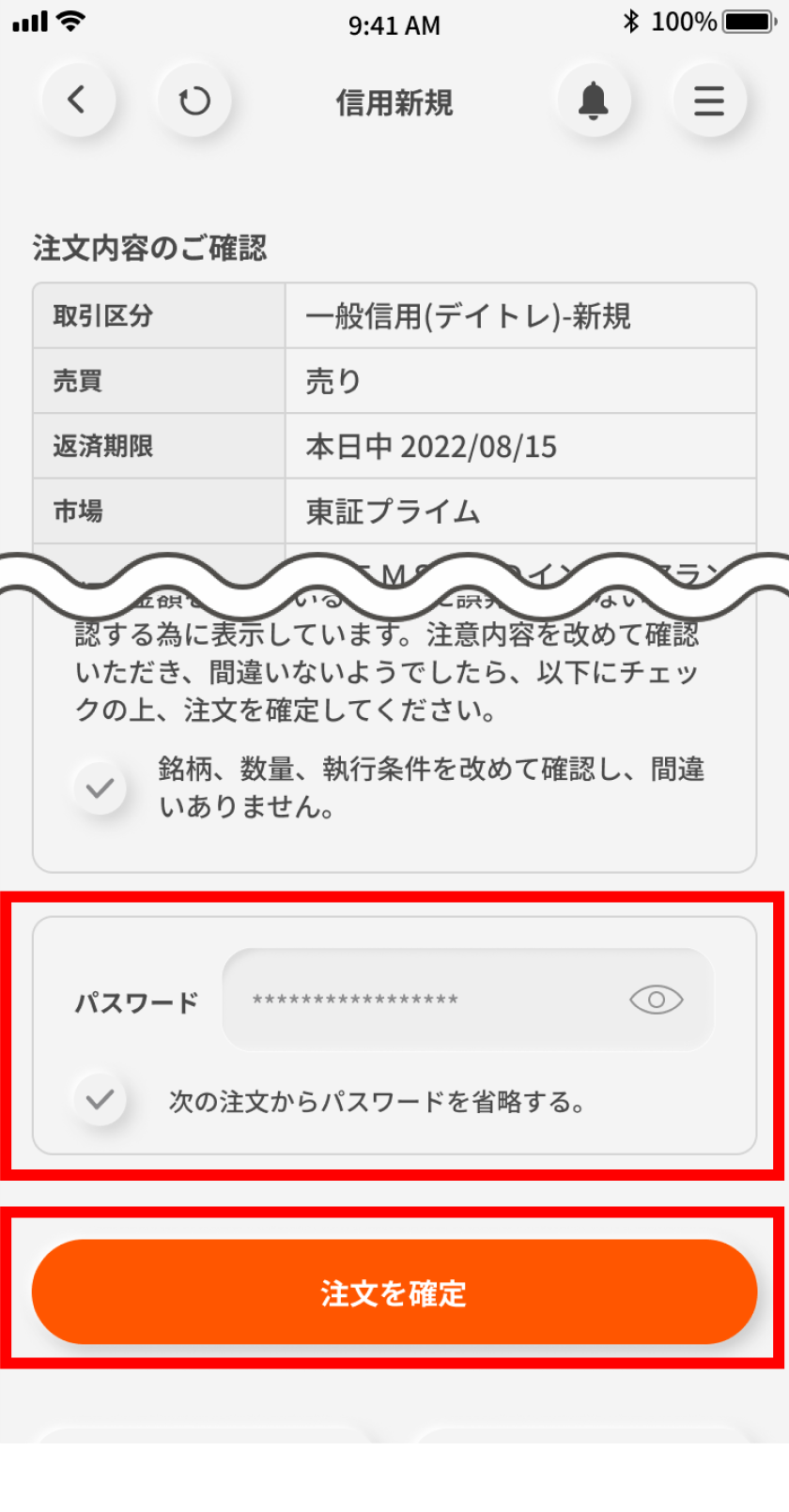 発注内容を確認のうえ、パスワードを入力し「注文を確定」ボタンをタップする。