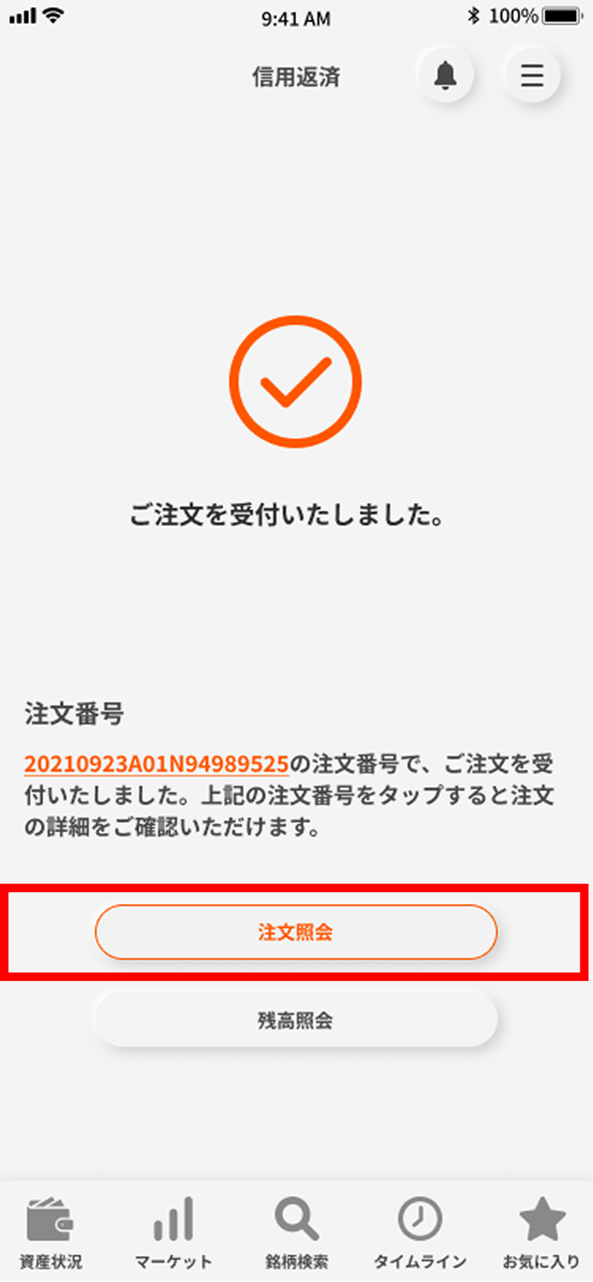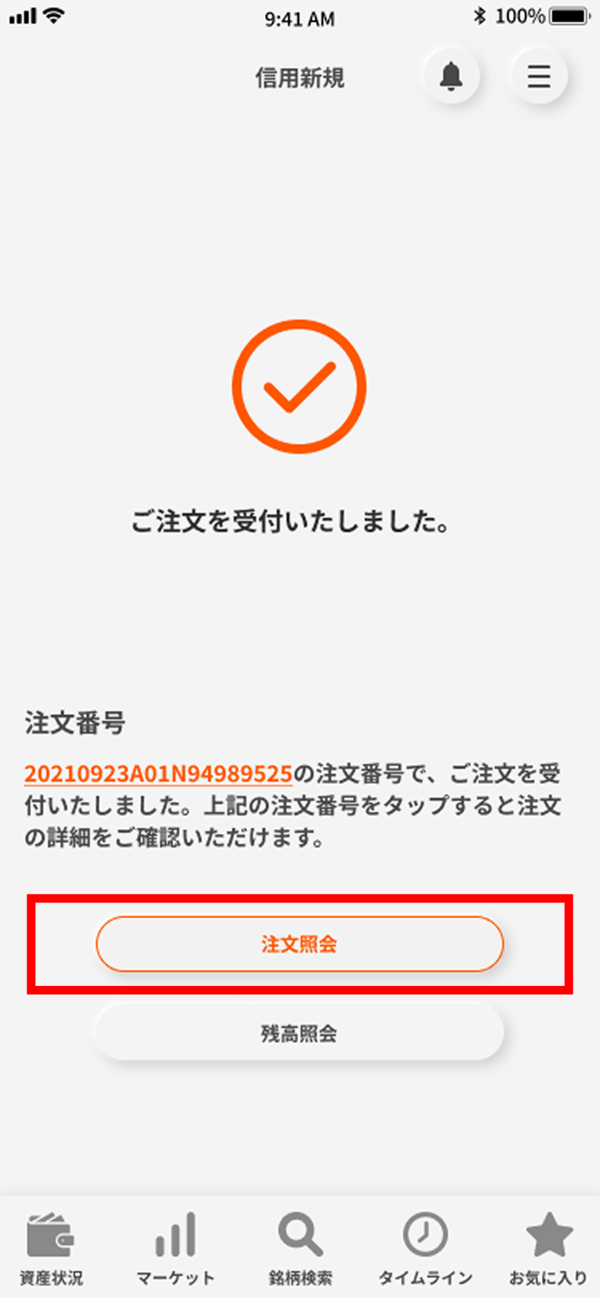 発注内容は「注文照会」ボタンからご確認いただけます。