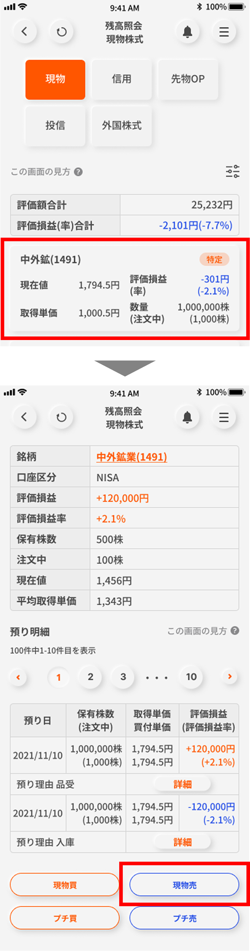 画面下部の「取引する」ボタンをタップして、「現物買」を選択する。