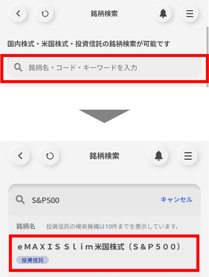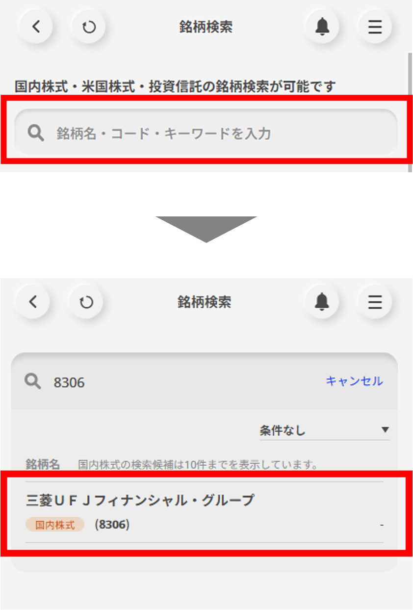 画面上部の検索窓に銘柄名を入力し、検索結果を選択する。