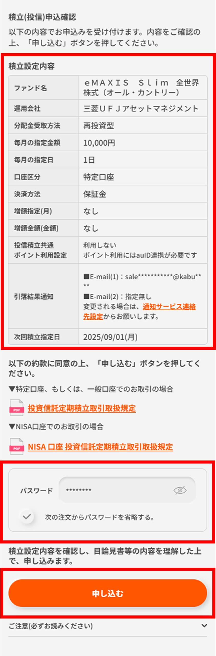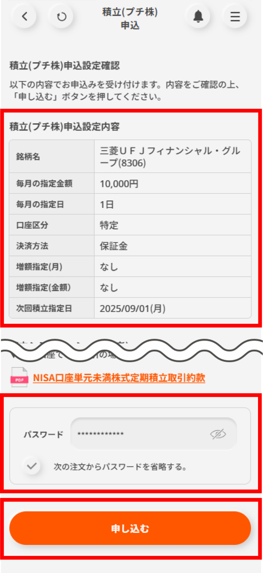 申込内容を確認し、パスワードを入力のうえ「申し込む」ボタンをタップするとお手続き完了です。