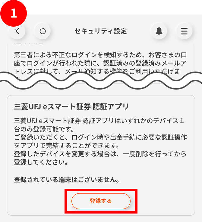 - 「三菱UFJ eスマート証券 認証アプリ」欄下部にある「登録する」ボタンをタップします