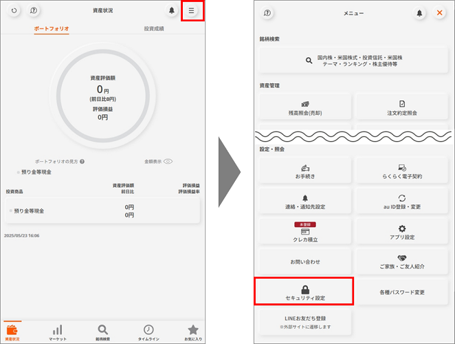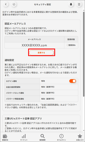 ログイン後、右上の三本線 → 「設定・照会」にある「セキュリティ設定」をタップし、ページ下部にある「変更する」ボタンをタップ。