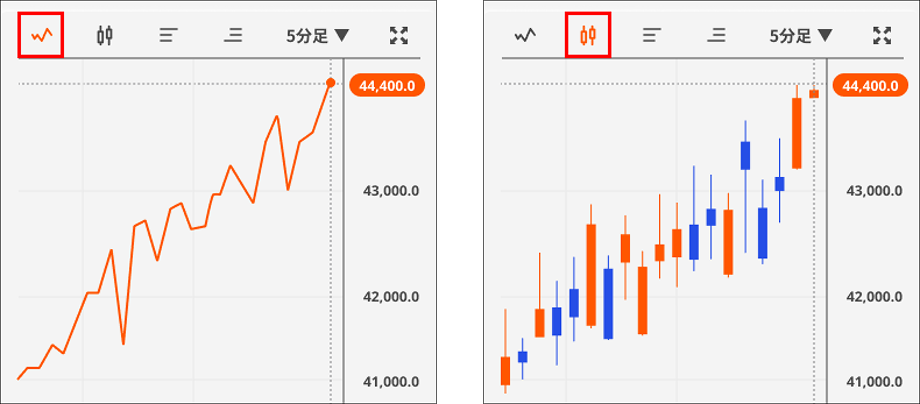 チャート形式は、チャート上部のアイコンをタップすることでラインチャートとローソク足の切り替えが可能です。