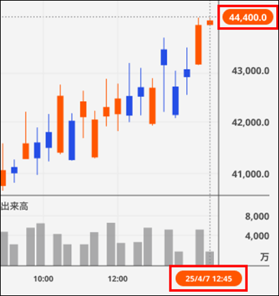 チャート上の各足をタップすると、該当する日時および終値がオレンジ色で強調表示されます。