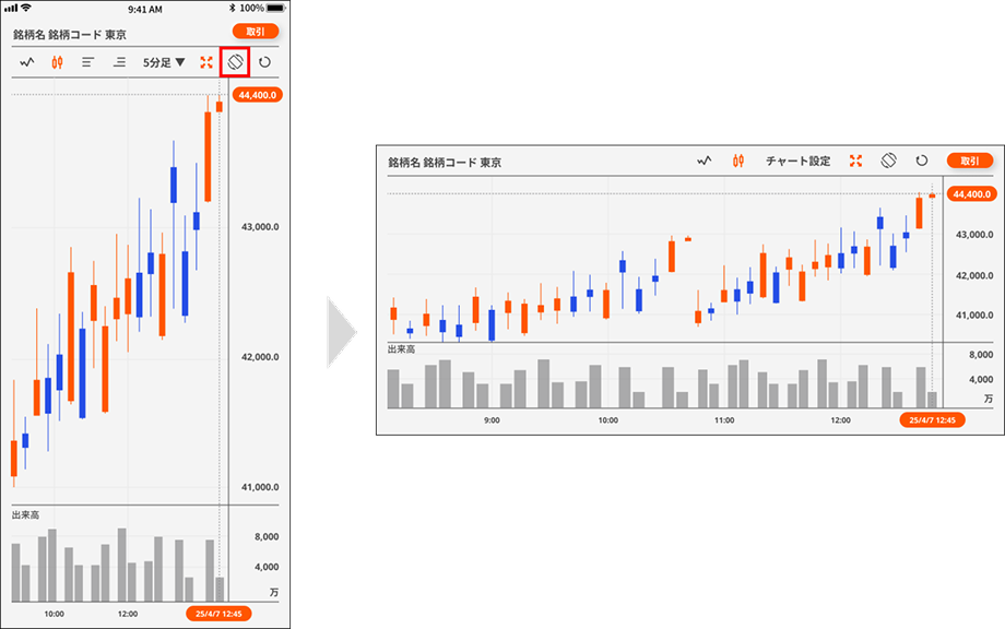 チャート右上にある回転アイコンをタップすることで全画面表示(横向き)への切り替えが可能です。