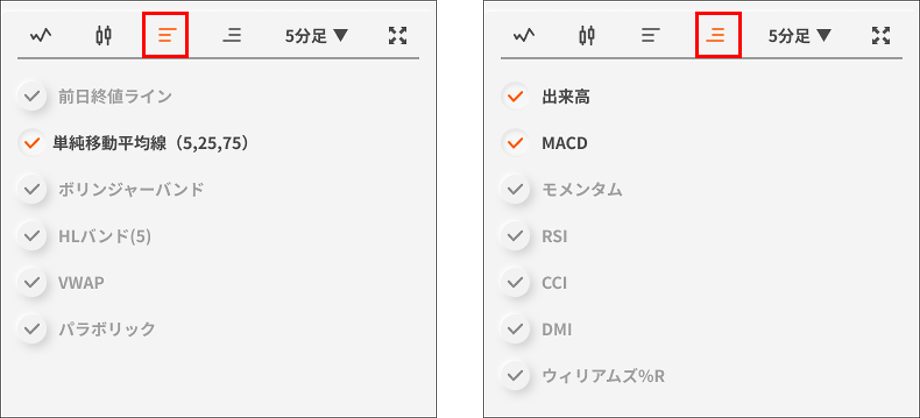 チャート上部のアイコンをタップすることでテクニカル指標の選択が可能です。